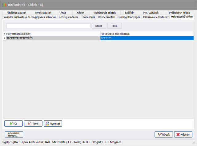 - Helyettesítő cikkek fülön az adott cikkhez helyettesítő termékeket tud megadni.