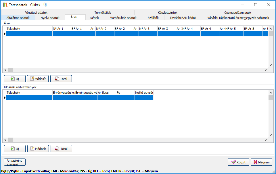 - Az Árak fülön rögzítse a cikkhez tartozó árakat és esetleges kedvezményeket!