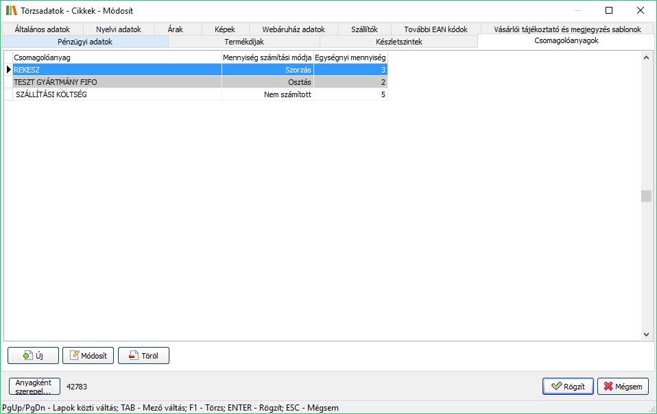 Itt rögzíthet a terméknek csomagolóanyagokat, melyeknek készletkezelési módja csak „Készletkezelés nélküli” vagy „FIFO”-s lehet.