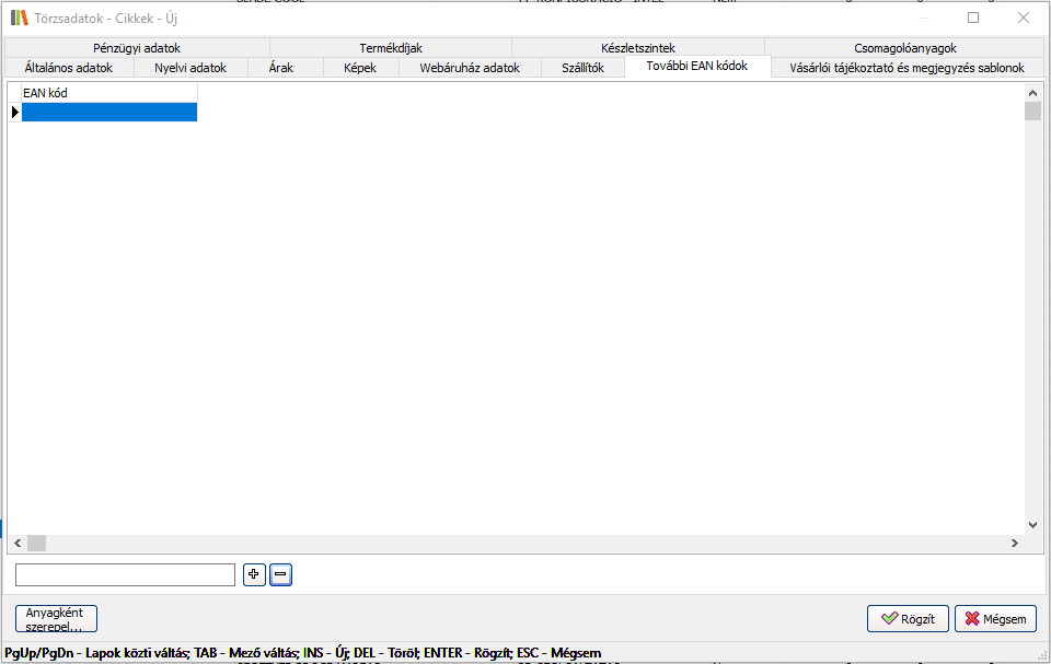 - A További EAN kódok fülön megadhat az Általános adatok fülön opcionálisan megadott 1 db EAN kód mellé továbbiakat is.