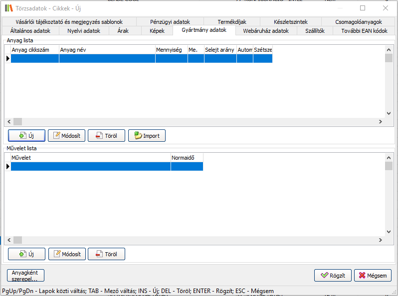 (Cikkszám kódoló) gombra! ( A cikkszám kódoló használatáról bővebben a A cikkszám pozíciók használata egy cikk kódolt cikkszámának generálásához c. fejezetben.) - Anyaglista gyártmányként vagy feldolgozás eredményeként fül: csak abban az esetben látható, ha be van jelölve a Gyártmány: Itt adja meg az alapanyagokat, hozzávalókat és a gyártással járó műveleteket.