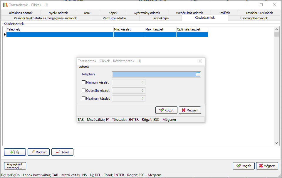 - Készletszintek fülön adható meg a Minimum, Maximum és Optimális készlet adatok, telephelyenkénti bontásban.