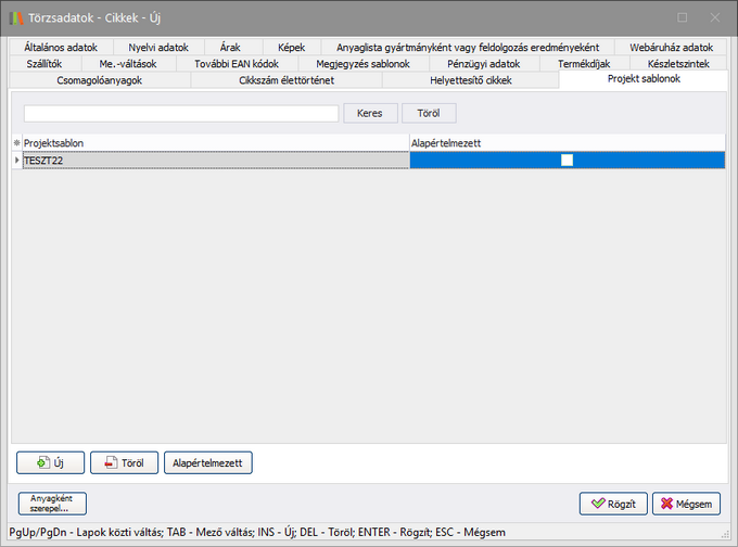 Itt van lehetőség a cikkhez projektsablon hozzárendelésére. A Projekt -> Projektsablonok menüpontban létrehozott sablonok közül választhat. Egy cikkhez tetszőleges számú projektsablon hozzáadható, és egy kijelölhető Alapértelmezett sablonnak.