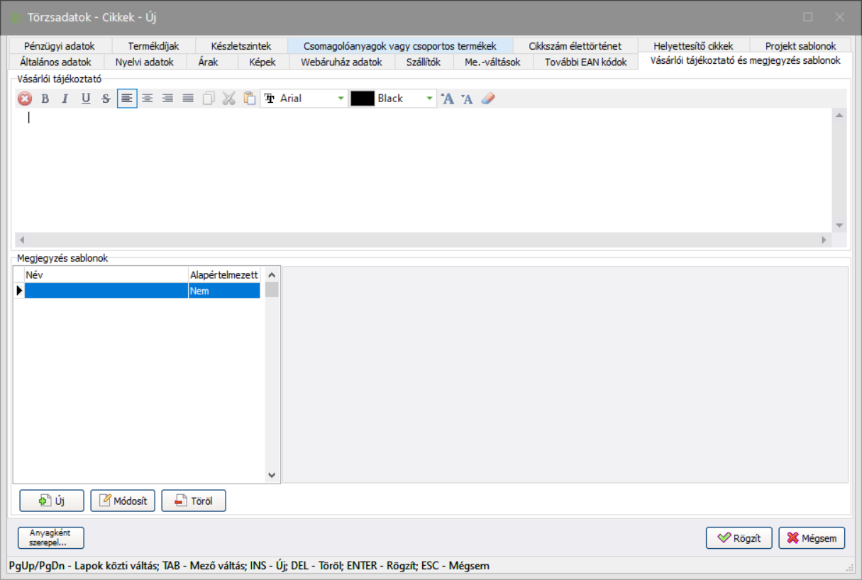 - A Vásárlói tájékoztató és megjegyzés sablonok fülön megadhat olyan sablonokat, melyek egy nyomtatandó bizonylaton, számlán jelennek meg a cikk alatt.