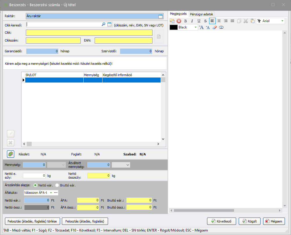 Fontos! A bizonylatra 0 Ft-os nettó beszerzői egységárú terméket rögzíteni nem lehet!