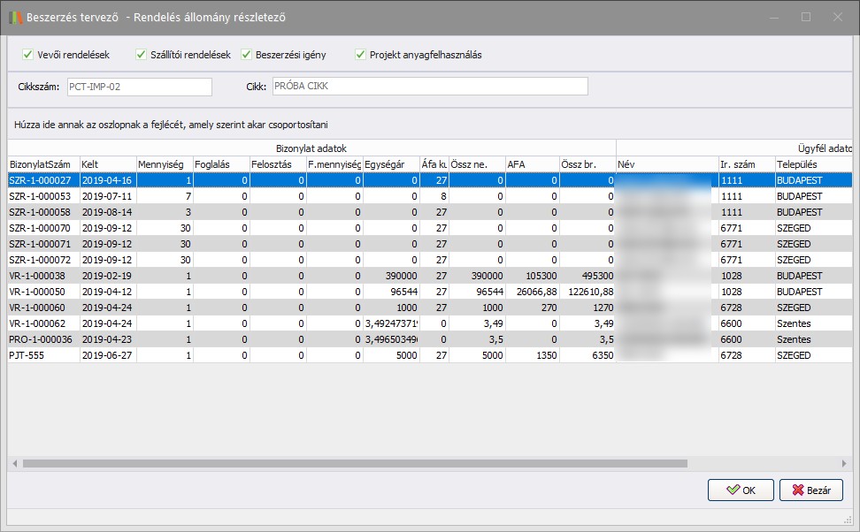 A Rendelés állomány részletezése gombbal megtekinthetők az adott cikkre vonatkozó részletes adatok: