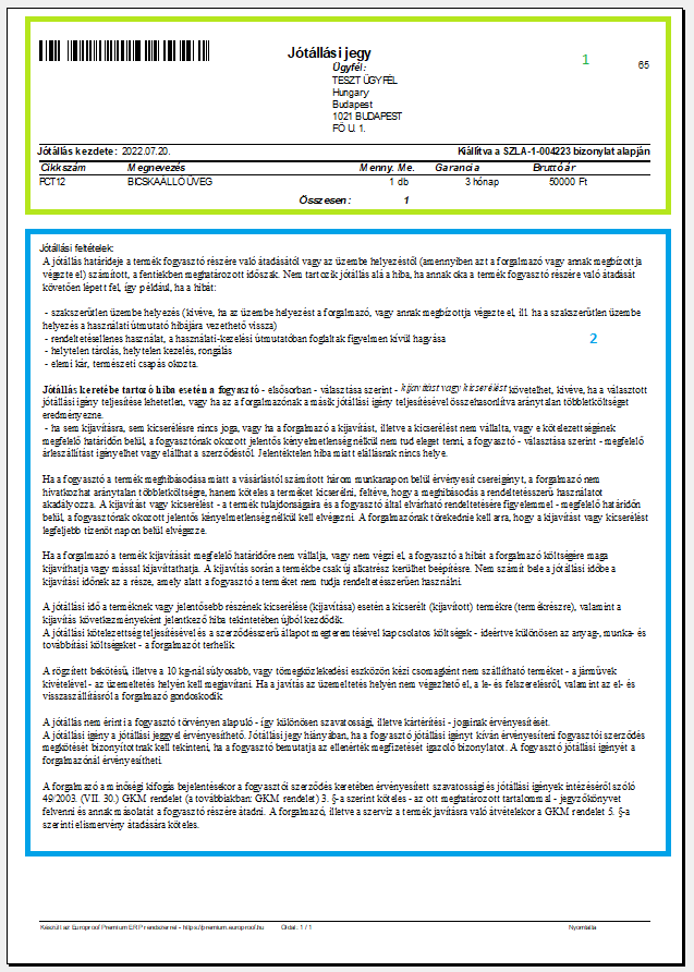 1. Bizonylatfej és bizonylattörzs: A jótállási jegy változó információit tartalmazza, többek között a kibocsátó cég és ügyfél adatait, a keltezést, tételeket és a garanciák időhosszát. Ezek az adatok az értékesítési bizonylat bizonylattörzséből automatikusan töltődnek ki, a listára tételeket kézzel fel- és arról levenni nem lehetséges.