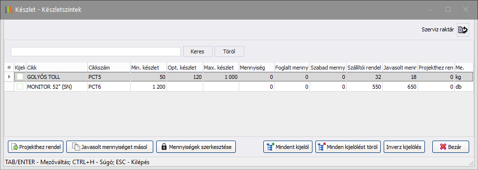 A készletszintek figyelésére van lehetőség azon cikkek esetében, melyek adatlapjain meg vannak adva a Készletszintek fülön a Minimum, maximum és optimális készletszint értékek. A listában azon cikkek jelennek meg, melyek esetében a szabad mennyiség és a szállítói rendelt mennyiség összege kisebb, mint a minimum készletszint.
