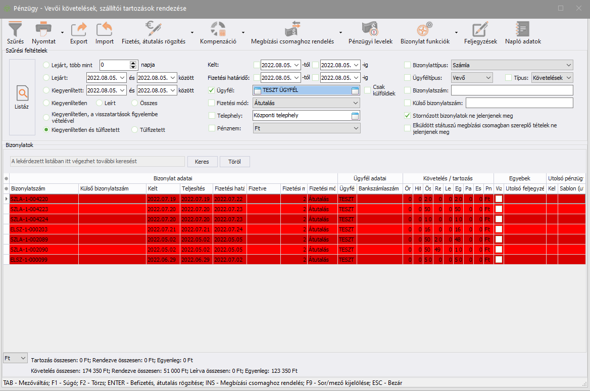 Ebben a menüpontban a rendszerben rögzített összes: Számla, Jóváíró számla, Külső számla, Beszerzési számla, Szállítói jóváíró számla és Költség számla típusú bizonylat adatai megjelennek. Fő funkciója a Kiegyenlítetlen státuszú számlához tartozó befizetések, átutalások és leírások rögzítése, karbantartása. Egyes készpénzes fizetési módú számlák már rögzítésükkor kiegyenlítettek (annak függvényében, hogy a fizetési módhoz tartozik-e automatizmus), kifizetettek, ezért elsősorban a halasztott fizetési módú számlák kiegyenlítése rögzíthető és tartható karban itt. A kiegyenlítések történhetnek Rendezésekkel és/vagy Leírásokkal. A rendezések tényleges fizetéseket jelentenek, olyanokat, amelyek megjelennek a pénzügyi bevételek között. A leírások olyan összegek, melyek nem kerülnek be a pénzügyi bevételek közé, de az Ügyfél felé történő Követelést csökkenti.