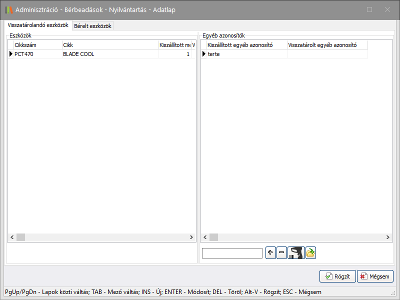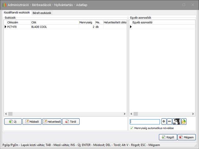 Amennyiben bérelt eszközt (Bérleményt) kíván visszatárolni, úgy válassza a Bérelt eszközök fület, majd módosítsa a tételnél a visszatárolandó mennyiséget.
