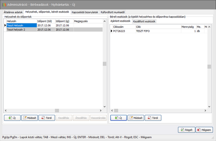 Ezen a fülön az ablak két részre tagolódik. Bal oldalon a Helyszínek és időpontok kezelésére van lehetőség, a jobb oldalon pedig a Bérelt eszközöket kezelheti.