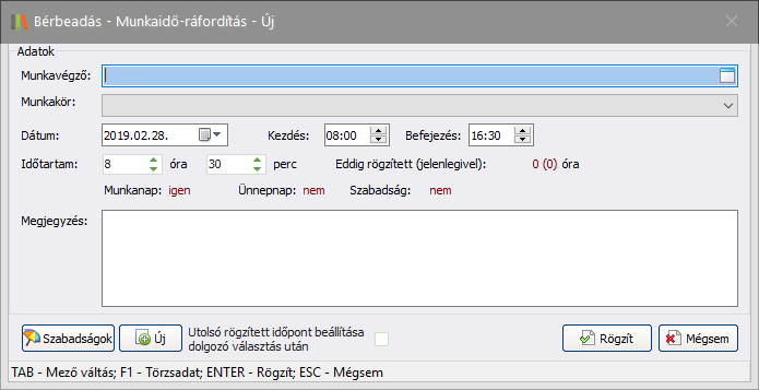 Ezen a felületen van lehetőség egy dolgozóhoz munkaidő rögzítésére: