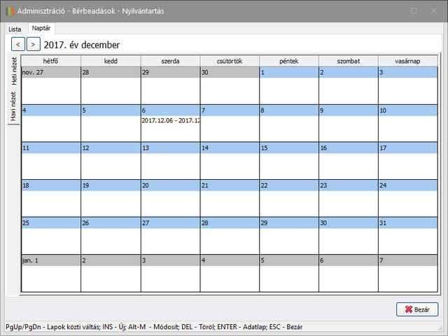Az Adminisztráció->Bérbeadások->Bérbeadások nyilvántartása menüpontban a Naptár fülön heti/havi nézetben áttekinthetők a bérbeadások. A lezárt bérbeadások nem jelennek meg a naptár nézetben.