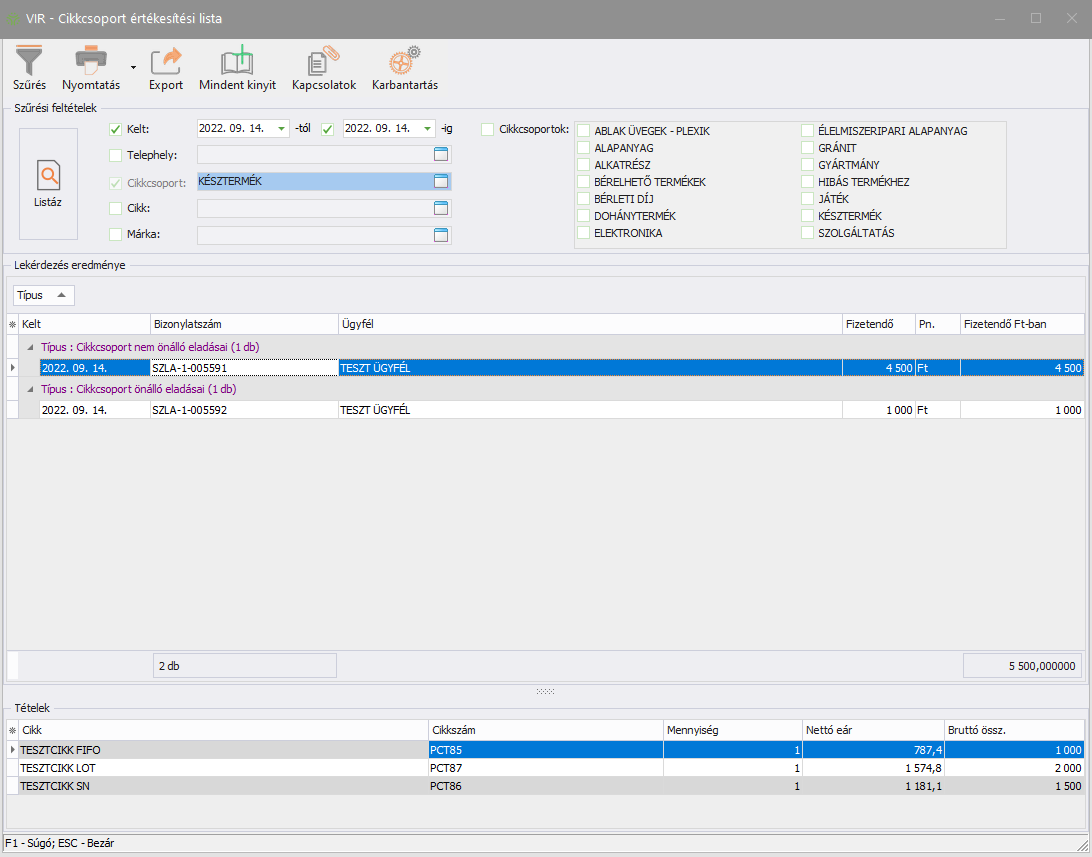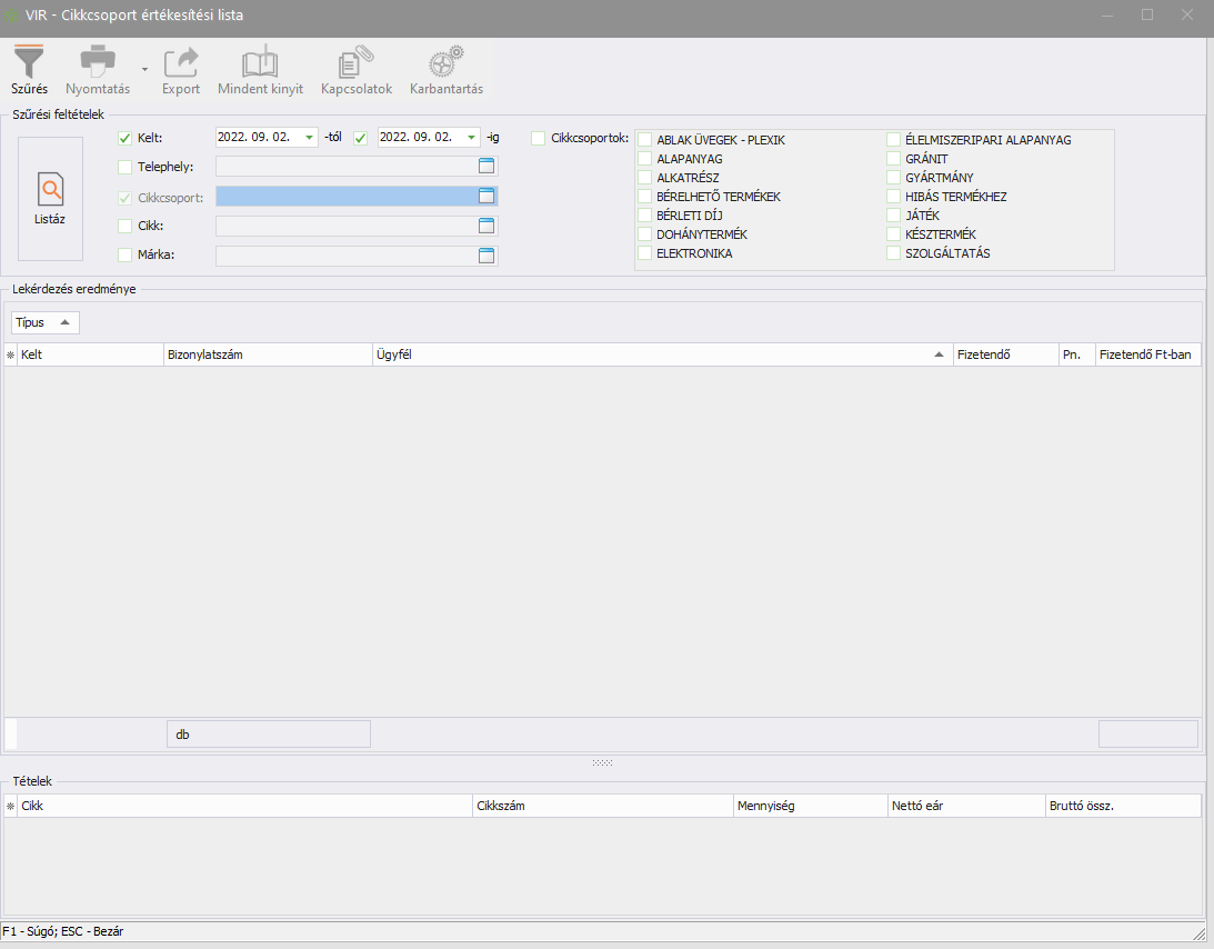 Elérése: VIR -> Cikkcsoport értékesítési lista