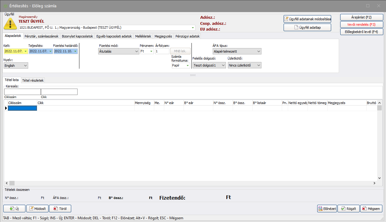 (Következő) gomb segítségével, vagy az F10 gyorsbillentyű használatával van lehetőség. - Ha szeretné megtekinteni az előleg számla nyomtatási képét rögzítés előtt, kattintson az