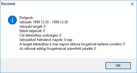Minden dolgozóhoz a HR modulban rögzíthet egy adott időszakra Targeteket (célokat). Ez azt számszerűsíti, hogy egy értékesítőnek mekkora forgalmat kell bonyolítania bizonyos fizetési bónuszok eléréséhez. Ezzel a kimutatással azt vizsgálhatja, egy–egy dolgozó adott időszakban rögzített értékesítései hogyan aránylanak az adott időszakban elvárt célokhoz képest. (Bővebben a Targetekről a HR, bér és cafeteria nyilvántartás - Targetek c. fejezetben.)