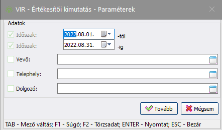 A megadott dátum intervallum között keltezett bizonylatok esetén vizsgálja az adott értékesítő munkáját. Alapértelmezett értéke az előző hónap első és utolsó napja.