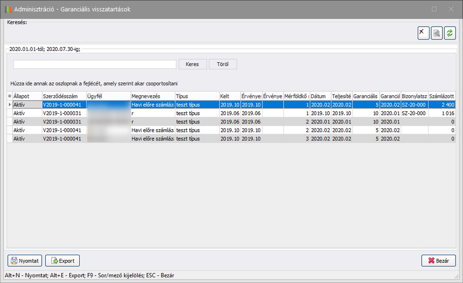 Ezzel a lekérdezéssel adott időszakra lehet akár az összes szerződés, akár egy kiválasztott szerződés vonatkozásában lekérdezni a lejáró visszatartásokat.