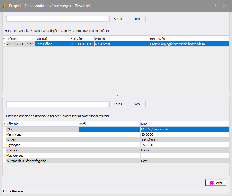 A Részletek gomb segítségével az adott aktivitás vonatkozásában tekinthetjük meg, hogy pontosan milyen adatok változtak a projektben (régi és új értékek is láthatók).