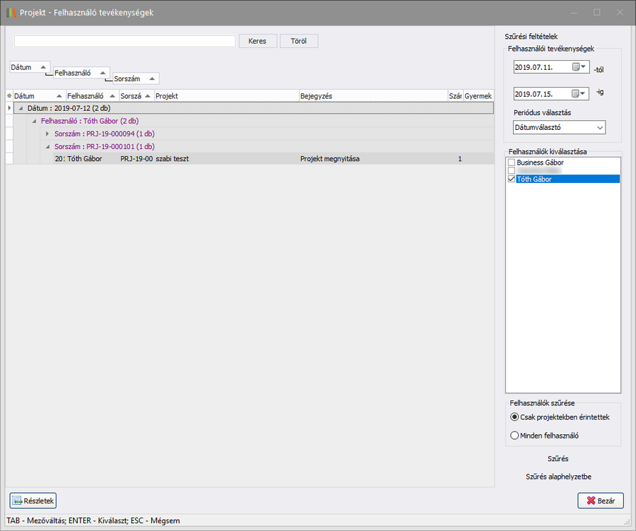 A szűrési feltételeknél kiválasztható a lekérdezési időszak, vagyis hogy milyen intervallumban lévő napló adatok kerüljenek listázásra. A periódus választásnál kiválasztható az intervallum helyett előző hét, hónap, és negyedév időszak is. Továbbá kiválasztható, hogy a lista mely felhasználó aktivitására vonatkozzon. A felhasználók köre változtatható: csak a projektben érintett (felelős, létrehozó, vagy résztvevő) vagy minden felhasználó közül választhassunk.
