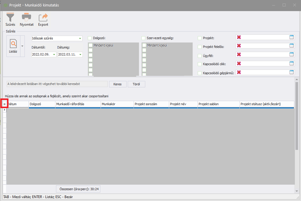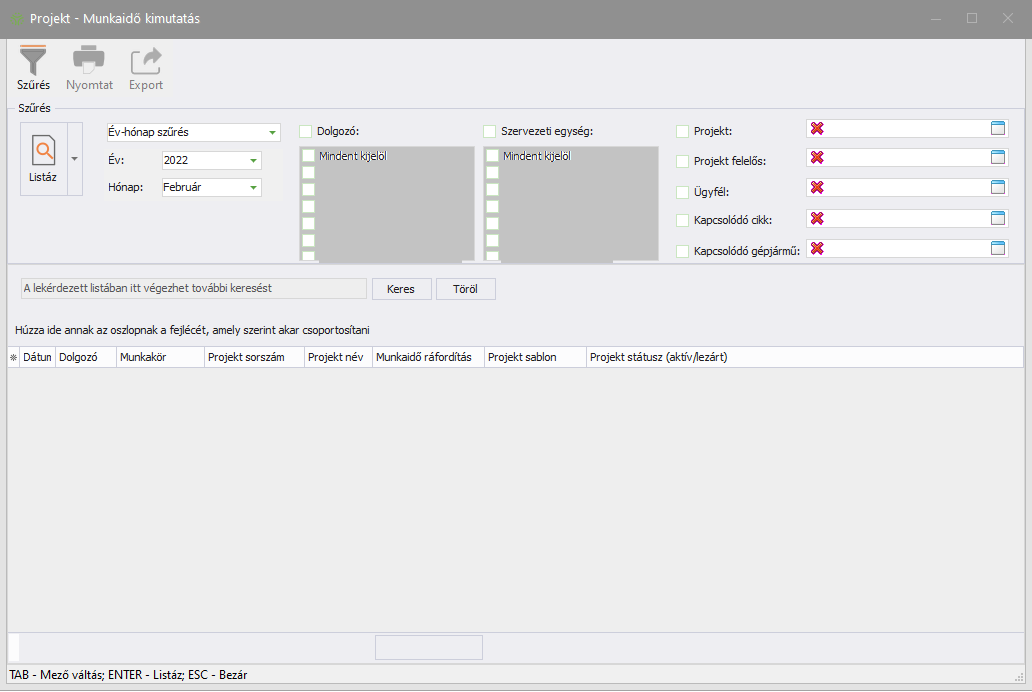 A Munkaidő kimutatás funkció megnyitásakor alapértelmezetten nincs adatmegjelenítés. A megnyíló Projekt - Munkaidő kimutatás ablakban az időszak, valamint a kívánt szűrési feltételek megadása után, a