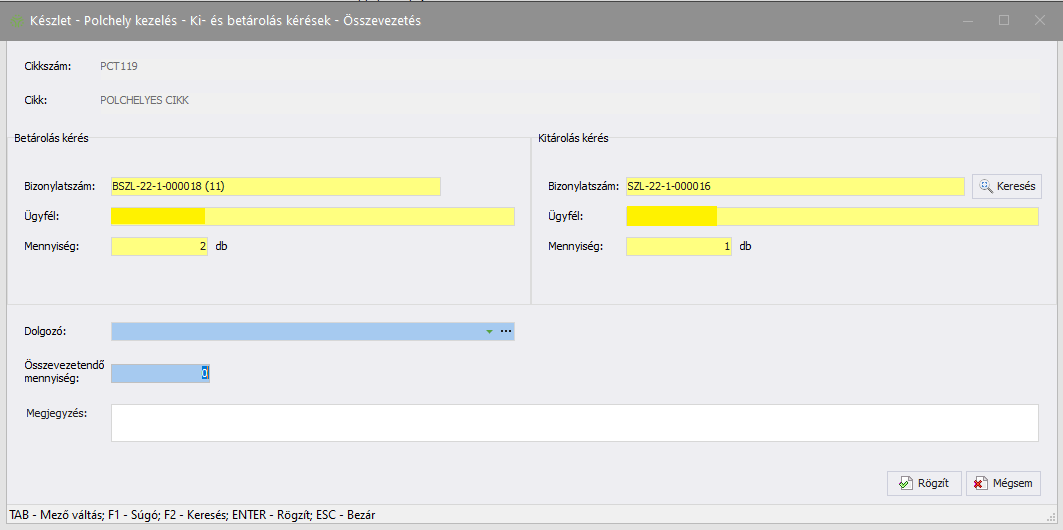 Az Összevezetések részben, vagy egészben feldolgozzák a ki- és betárolási kéréseket, de polchely mozgásokat nem generálnak, tehát az érintett cikk nem kerül ezáltal polchelyre. Az Összevezetések stornózhatók, amely visszanyitja az érintett feldolgozott ki- és betárolási kéréseket.