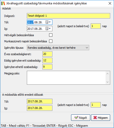 Ezzel a funkcióval egy, már jóváhagyott szabadsághoz módosítási igényt rögzíthet. A módosítási igény egy újból jóváhagyandó tétel: egy - a megfelelő jogosultságokkal rendelkező - felhasználónak jóvá kell hagynia.