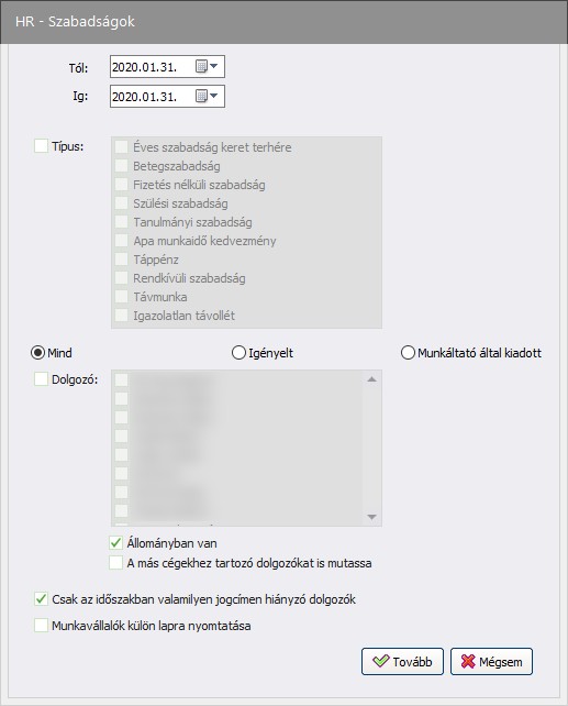 Csak az időszakban valamilyen jogcímen hiányzó dolgozók jelölőt, így csak azok a dolgozók kerülnek a lsitába, akik a beállított dátum intervallumon belül hinyoztak a munkából valamilyenn jogcímen. (pl szabadság, betegszabadság, ...)