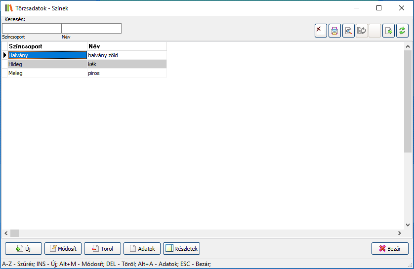 Elérése: Törzsadatok -> Egyéb -> Szín törzs