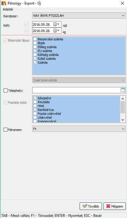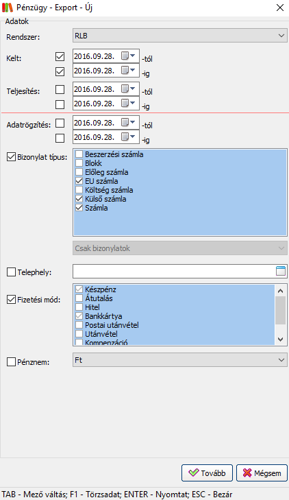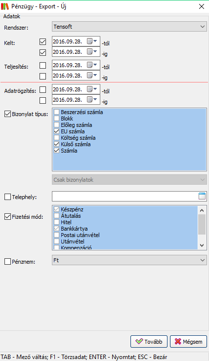 Fontos! A rendszer a legtöbb szűrési feltételt automatikusan beállítja az export során!