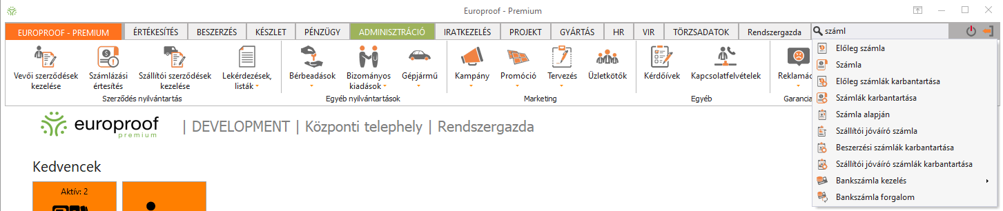 A főmenü funkciói közötti keresést megkönnyíti az utolsó funkciócsoport-fül melletti szöveges kereső mező. Csak kattintson a kereső mezőbe, kezdje el gépelni a keresett funkció nevét és válasszon a keresés találatai közül, melyre kattintva a keresett funkció elindítható.