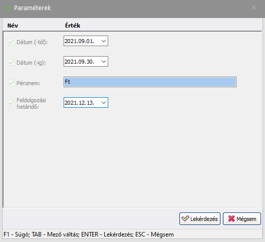 (Tovább) gombbal lépjen tovább és adja meg a lekérdezés paramétereit. Ezek a paraméterek minden lekérdezés estében eltérőek.