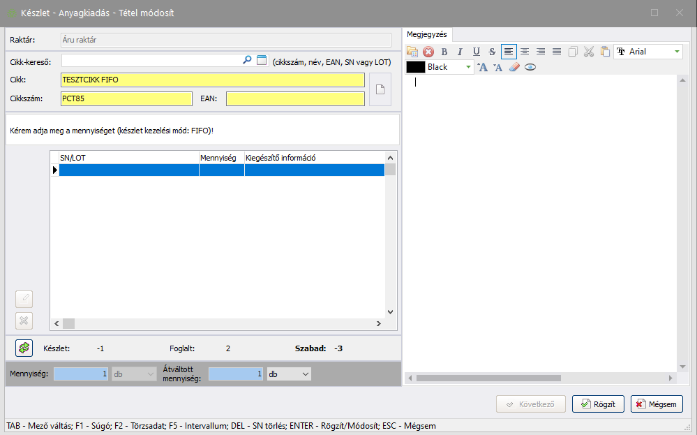 mezőbe a cikkhez tartozó megjegyzést. - Ha szeretné rögzíteni a tételt, kattintson a