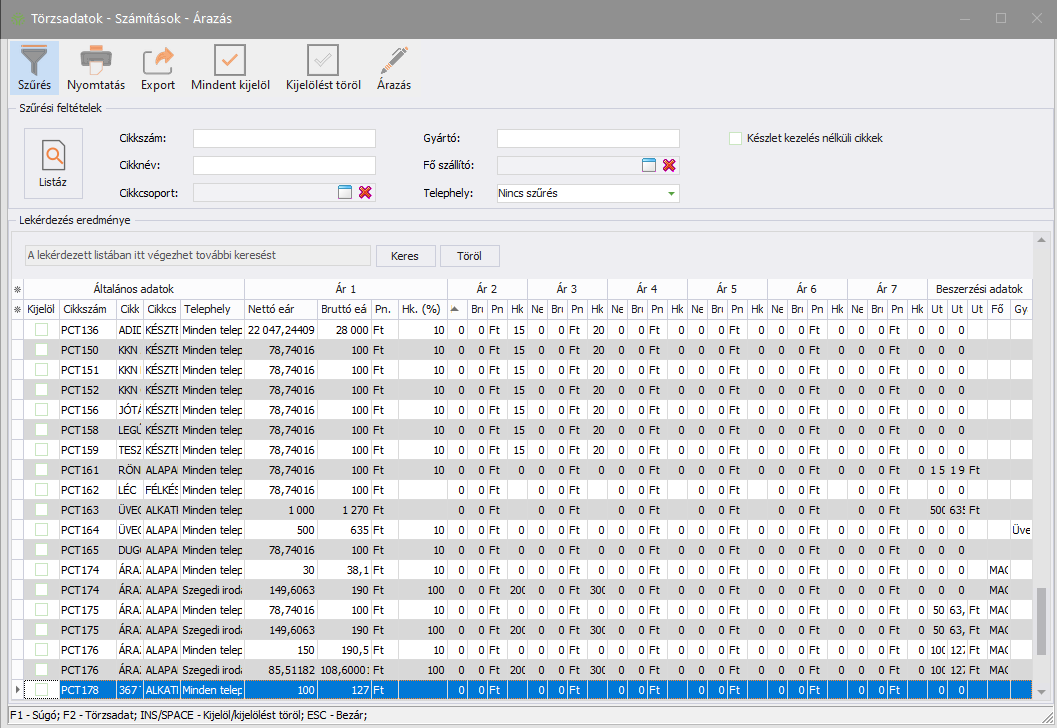 Az Árazás ablakba a lista alapértelmezetten betöltődik a menüpont megnyitásakor. A lista figyelembe veszi a cégenként elkülönített Cikk törzs, telephelyenként elkülönített Cikk törzs paraméterek beállításait.