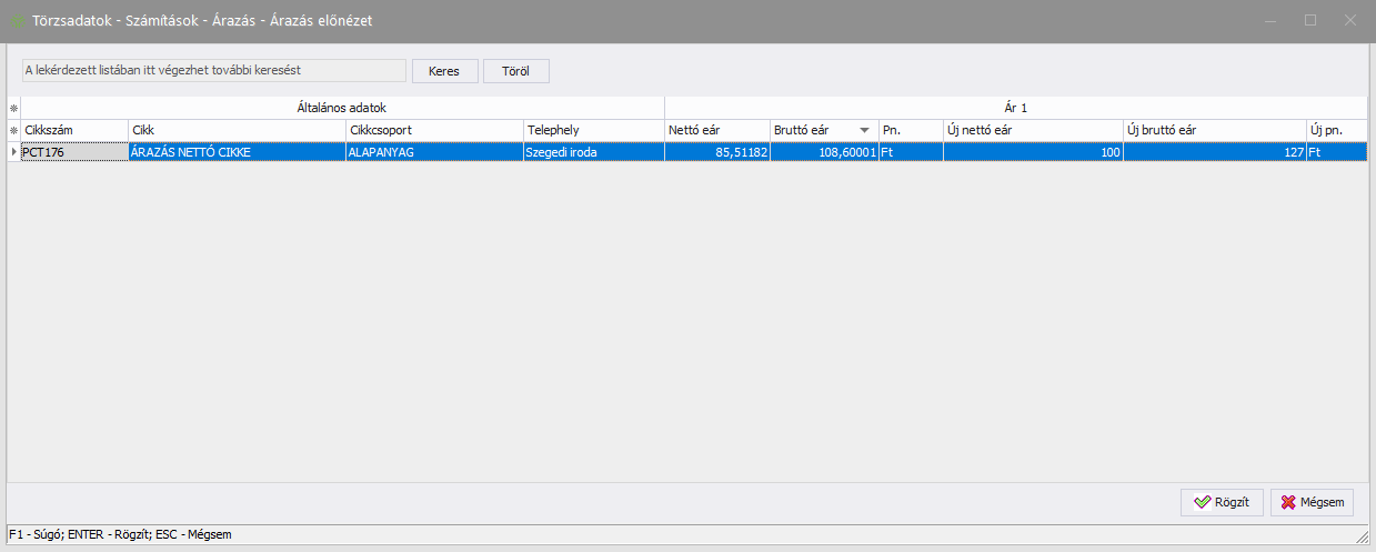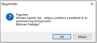 - a rendszer a megadott értékkel (negatív érték esetében csökkentve, pozitív esetén növelve) fogja módosítani a kíválasztott cikk/telephely kombinációk esetében a kijelölt árszintekhez tartozó bruttó árat. Pénznemen nem változtat.