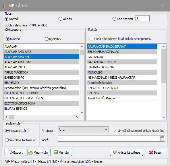 Kijelöltek. Ha a Kijelöltek opciót választotta, akkor a listából válassza ki, mely cikkcsoportok kerüljenek fel az árlistára. Több elem kiválasztásához tartsa nyomva a CTRL billentyűt! - A