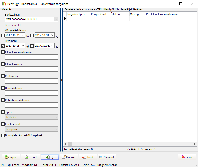 Az ablak alján található gombok segítségével karbantartható a kijelölt bankszámla forgalom.