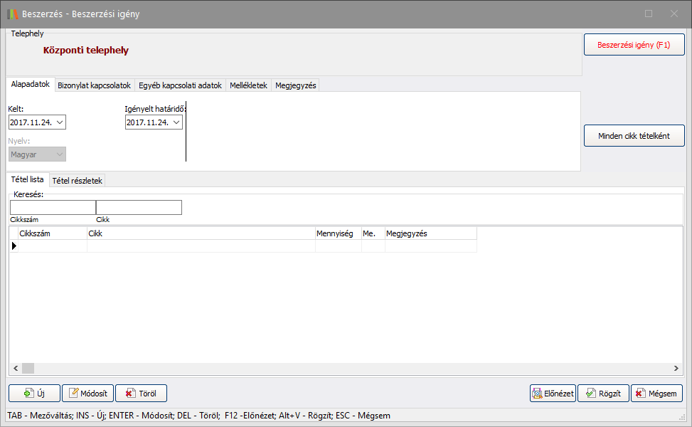 Ebben az ablakban van lehetősége a Beszerzési igény típusú bizonylatok karbantartására.