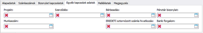 Egyéb kapcsolati adatok fülön a számla hozzáadható Projekthez, Szerződéshez, Bérbeadáshoz, Munkaszámhoz, Pénztár bizonylathoz és/vagy Banki forgalom bizonylathoz, továbbá kapcsolható hozzá Eredeti Sztornózott számla hivatkozás.