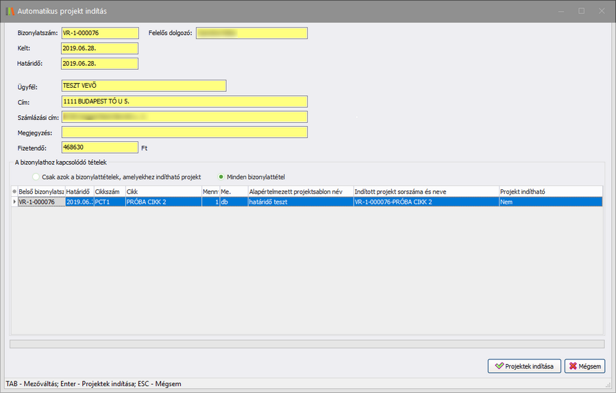 (Automatikus projekt indítás) gombbal a bizonylat minden tételéhez generálódik automatikusan egy projekt. Ennek előfeltétele, hogy legyen a rendszerben legalább egy projektsablon, a bizonylathoz legyen felelős dolgozó megadva, valamint a bizonylaton szereplő cikkekhez legyenek alapértelmezett (!) projektsablonok beállítva (minden cikk adatlapján). A cikk adatlapon beállított alapértelmezett projektsablon alapján jön létre a projekt, melyhez kapcsolódó bizonylatként hozzárendeli az adott bizonylatot. A projekt adatlapon látható lesz az előzmény bizonylat száma, valamint a cikk, melyből a projekt létrejött. A megjelenő ablakban megtekinthetjük a fontosabb adatokat. Az alsó, bizonylathoz kapcsolódó tételek listában a választógombok segítségével vagy minden bizonylattételt, vagy csak azokat láthatjuk, melyekhez a projektindítás feltételei teljesültek és indítható velük projekt. Ha a listában több olyan tétel szerepel, melyhez indítható projekt, akkor minden tételhez külön projektet fog a rendszer létrehozni. Miután a projekt(ek) létrejött(ek), a projekt adatlap(ok) a Projektek modul Projektek kezelése menüpontból elérhető(k). A bizonylatszám ez esetben is a projekten kapcsolódó bizonylatként fog szerepelni.