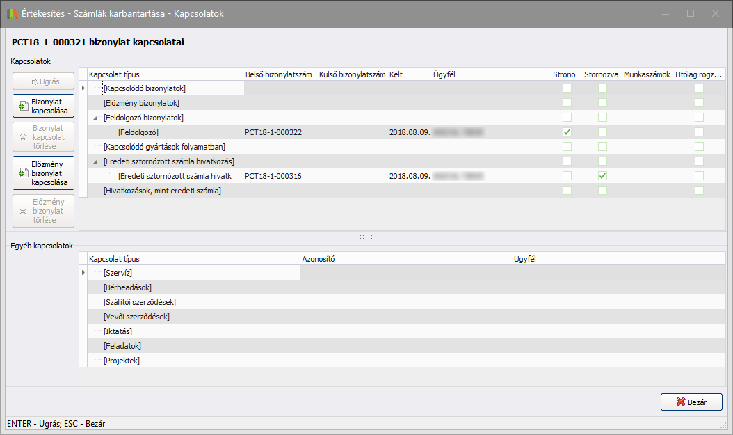 Amennyiben a kijelölt bizonylat rendelkezik egyéb kapcsolatokkal, az az alsó, Egyéb kapcsolatok ablakrészben látható.