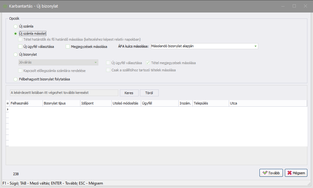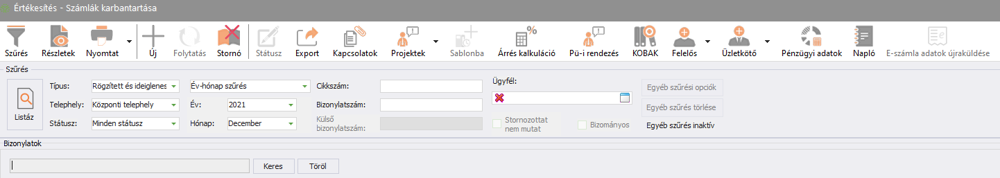 Fontos! A keltezési év választólistájánál kizárólag azok az évek jelennek meg, amelyekben voltak rögzített bizonylatok! Évváltás esetén, amennyiben a jelenlegi évben még nincsenek rögzített bizonylatok, úgy egyetlen karbantartási ablakban sem választható ki a jelenlegi év. Amint megtörténik az első (bármilyen típusú) bizonylat rögzítése, minden karbantartási ablakban választhatóvá válik az aktuális év szűrési feltételnek.