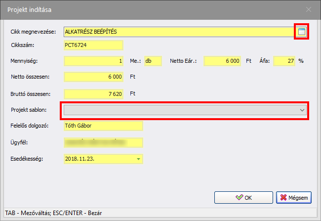 A gomb aktív, amennyiben a bizonylat tételhez még nem lett projekt indítva. A megjelenő ablakban megtekinthetjük a fontosabb adatokat, valamint amennyiben a cikkhez több projektsablon is meg van adva, kiválaszthatjuk a legördülő mezőből, mely projektsablonnal kívánjuk a projektet létrehozni. A cikkhez alapértelmezettként beállított projektsablon lesz a kiválasztott a projekt indító ablakban. Ha a cikkhez nincs megadva egyetlen projektsablon sem, akkor a Cikk megnevezése mező jobb oldalán lévő ablak ikonra kattintva megnyithatjuk a cikk adatlapját, és a Projektsablonok fülön rögzíthetünk új projektsablonokat a cikkhez. Bővebben: Cikk létrehozása - Projektsablon fül