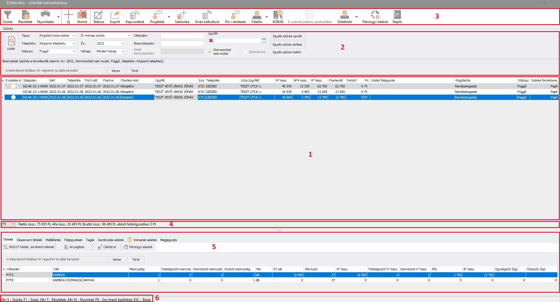 - 1: Bizonylatok szűrt listája. Ebben a keretben jelennek meg azok a bizonylatok, amelyek megfelelnek az ablakon belül beállított szűrési feltételeknek. A lista elemei színekkel megjelölve jelennek meg, melyet a program beállításaiban egyedileg módosíthat. Amennyiben ebben a keretben egy elemre kattint, úgy az 5-ös résznél levő részleteknél több információt olvashat el az adott bizonylatról. A bizonylat listában alapértelmezésben csak a már rögzített bizonylatok jelennek meg, de a Szűrés gombbal előhívható szűrési feltételek között kiválasztható, hogy a mentett, ideiglenes bizonylatok is bekerüljenek a listába. Az ideiglenes bizonylatok esetében az elérhető funkciók száma jelentősen korlátozott. Az ideiglenes bizonylatokkal kapcsolatos tudnivalókról bővebben lejjebb olvashat.
