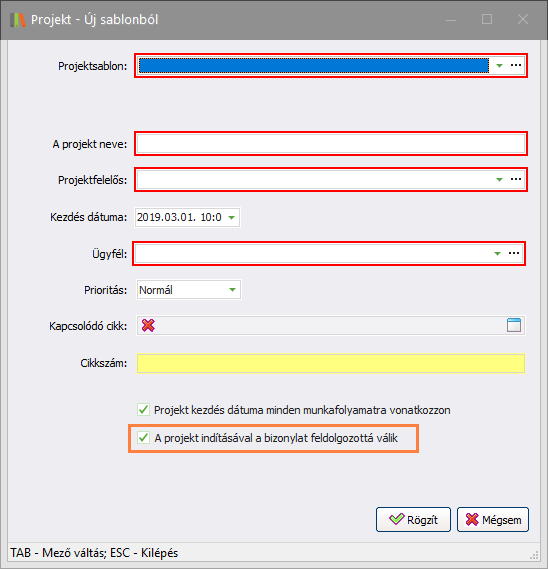 Ez esetben a projekt indítása megegyezik a Projekt modulban történő új projekt indítási folyamatával. A megjelenő ablakban ki kell választani a projektsablont, a projekt felelőst, valamint a projekt ügyfelét.