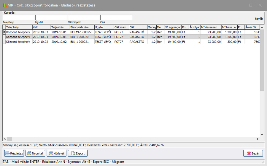 A részletező ablakban látható az eladások részletezése, itt az egyes értékesítési bizonylatok részletei tekinthetők meg. Amennyiben egy soron ismét a Részletez gombot választja, úgy az adott eladással összefüggő beszerzési bizonylat adatai láthatók.