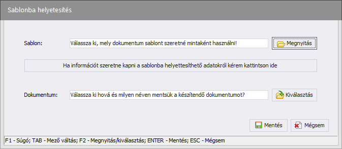 - Dokumentum: a funkció futtatása eredményeként előálló dokumentum neve és helye. A dokumentum a sablon másolata lesz, a rendszer vezérlő szövegek illetve könyvjelzők helyére helyettesíti a megfelelő adatokat.