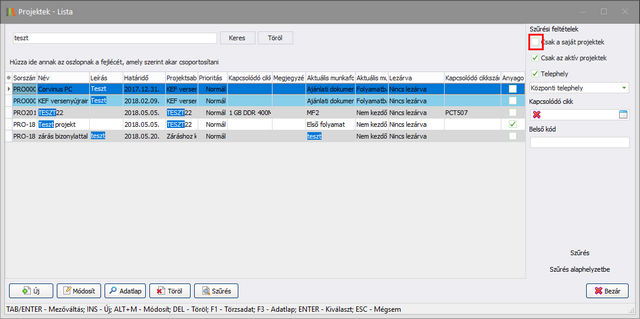- A választólista segítségével kiválaszthatja, hogy a projektlista csak a saját projekteket listázza, vagy láthatók legyenek a mások által létrehozott projektek is. Saját projektnek számít az, ha a projektet a bejelentkezett felhasználó hozta létre, vagy ha valamely munkafolyamatában Résztvevőként van megjelölve az adott (bejelentkezett) dolgozó.