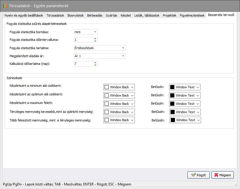 A Beszerzés -> Beszerzés tervező menüpontban megjelenő beállítások alapértelmezéseit állíthatja itt be, illetve a különböző színezések testreszabhatók. Ezen beállítások a beszerzési tervezőben megváltoztathatók.