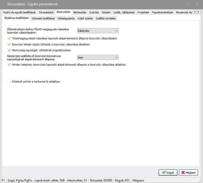 Elérése: Törzsadatok -> Egyéni paraméterek -> Bizonylatok (fül) -> Általános beállítások (fül) vagy